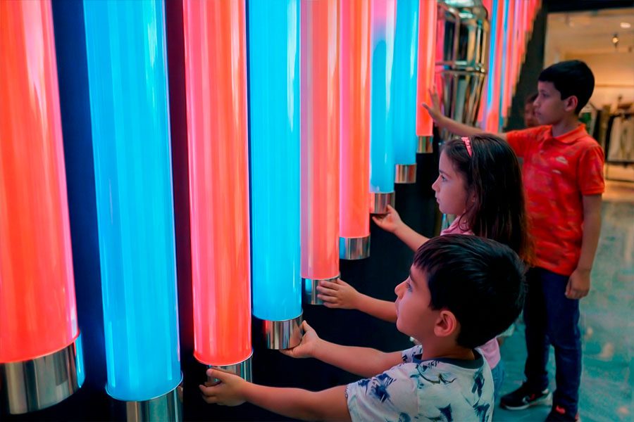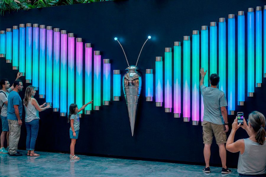 The light component is complemented by sound, reinforcing the perception of a truly “alive” object. Every interaction is paired with distinctive sounds and melodic fragments, forming a delicate musical atmosphere and heightening emotional impact. When multiple visitors engage simultaneously, “Butterfly” transforms into a synchronized collective experience: individual gestures blend into a shared light-and-sound choreography — always evolving and never repeating.