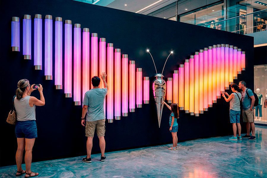 “Butterfly” is a landmark interactive light-and-sound installation for shopping malls, conceived as a family magnet and a выразительный architectural accent within the interior environment. Two wings create a bold, instantly recognizable silhouette approximately 7 meters wide, formed by 34 matte-white acrylic columns Ø150 mm (17+17). The opaque matte acrylic ensures a deep, uniform glow with no visible light sources — illumination appears as a “living material”: soft, elegant, and visually continuous. At the heart of the composition stands a butterfly body sculpture crafted from polished stainless steel, approximately 1.1 m high.