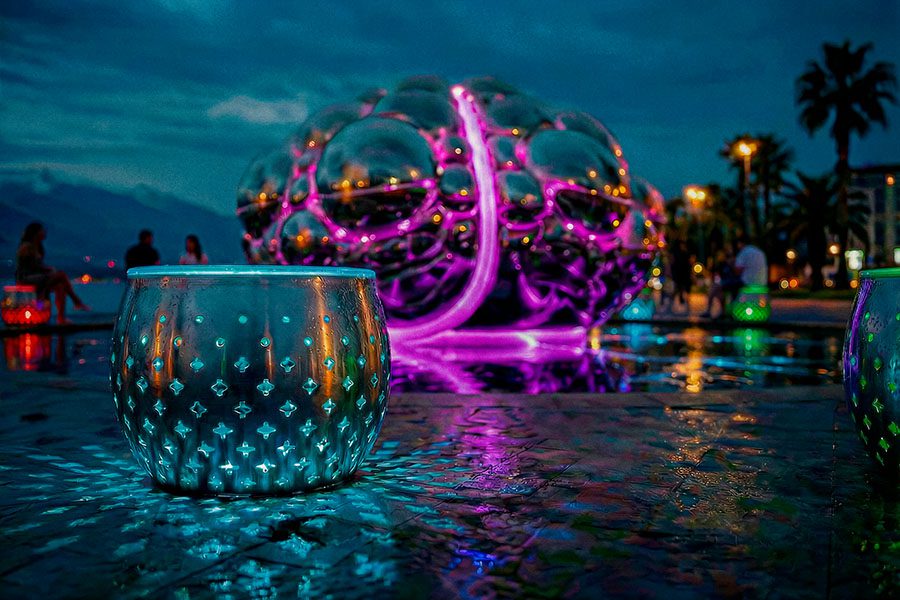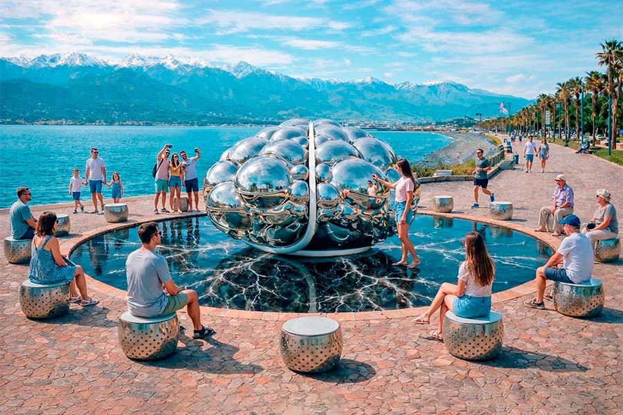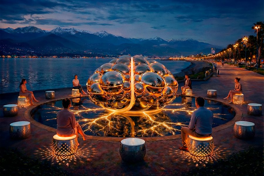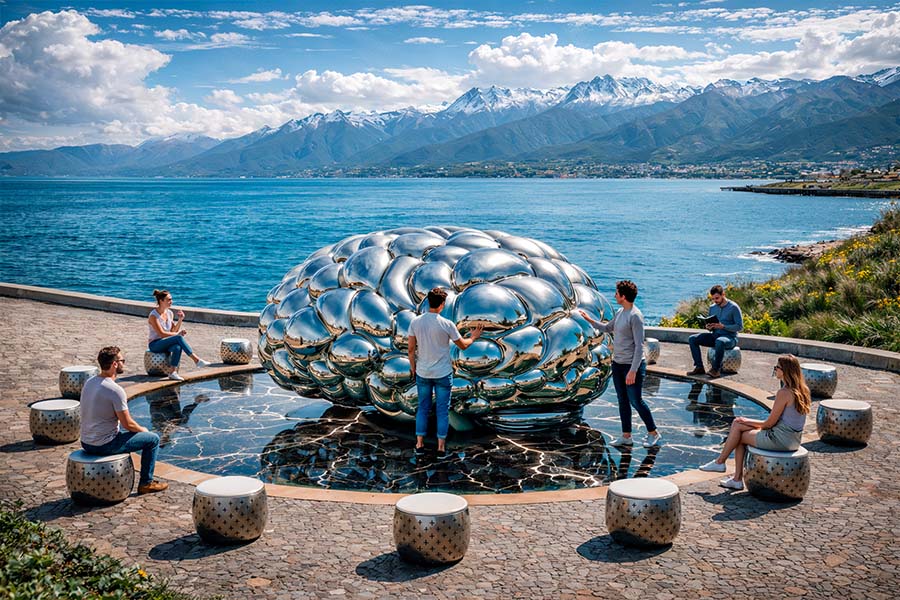 In its complete form — an iconic mirror sculpture in polished stainless steel reflecting every visitor; continuous large-scale interaction; AI-created one-minute light-music performances twice per hour; and the global concept of cities as interconnected nodes — GLOBE MIND stands without direct analogs, emerging as a cultural emblem of the AI era.