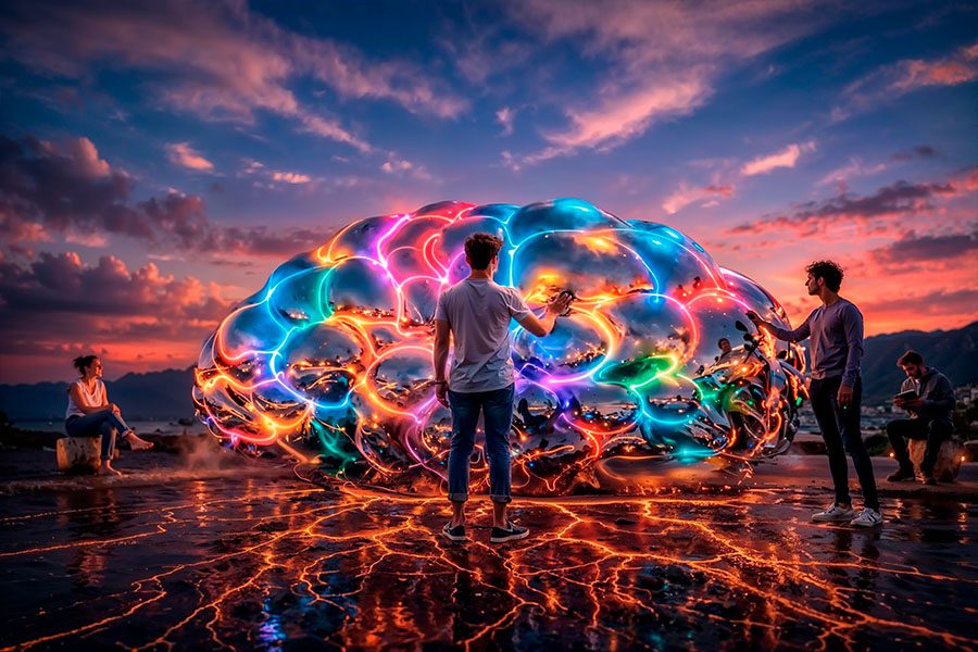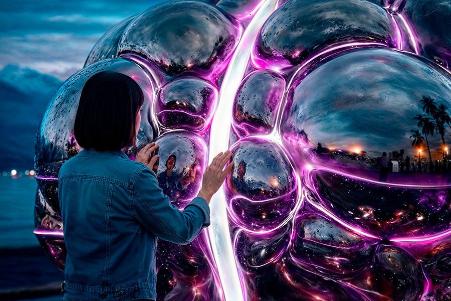 GLOBE MIND is a tangible embodiment of the “Global Mind”: a mirror-polished, brain-shaped sculpture of a new era that awakens through human presence and is driven by artificial intelligence. Here, AI manifests through response — light, sound, and the subtle “breathing” of space — an atmosphere you can sense, hear, and witness in your own reflection.